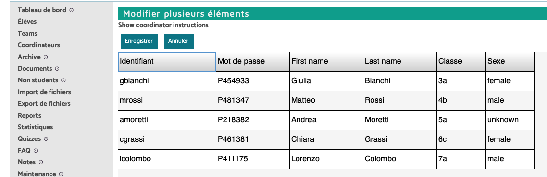 Vous pouvez également régénérer les mots de passe (par ex. avant le concours). Pour cela, sélectionnez les connexions des élèves (cochez la case) et cliquez sur « Régénérer les mots de passe pour la sélection ».